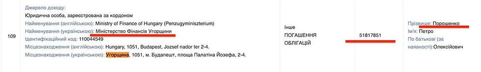 In addition, the MP's declaration states that on November 5, 2025, Poroshenko transferred about UAH 14.5 million from Ukraine through the purchase of Hungarian government bonds.
